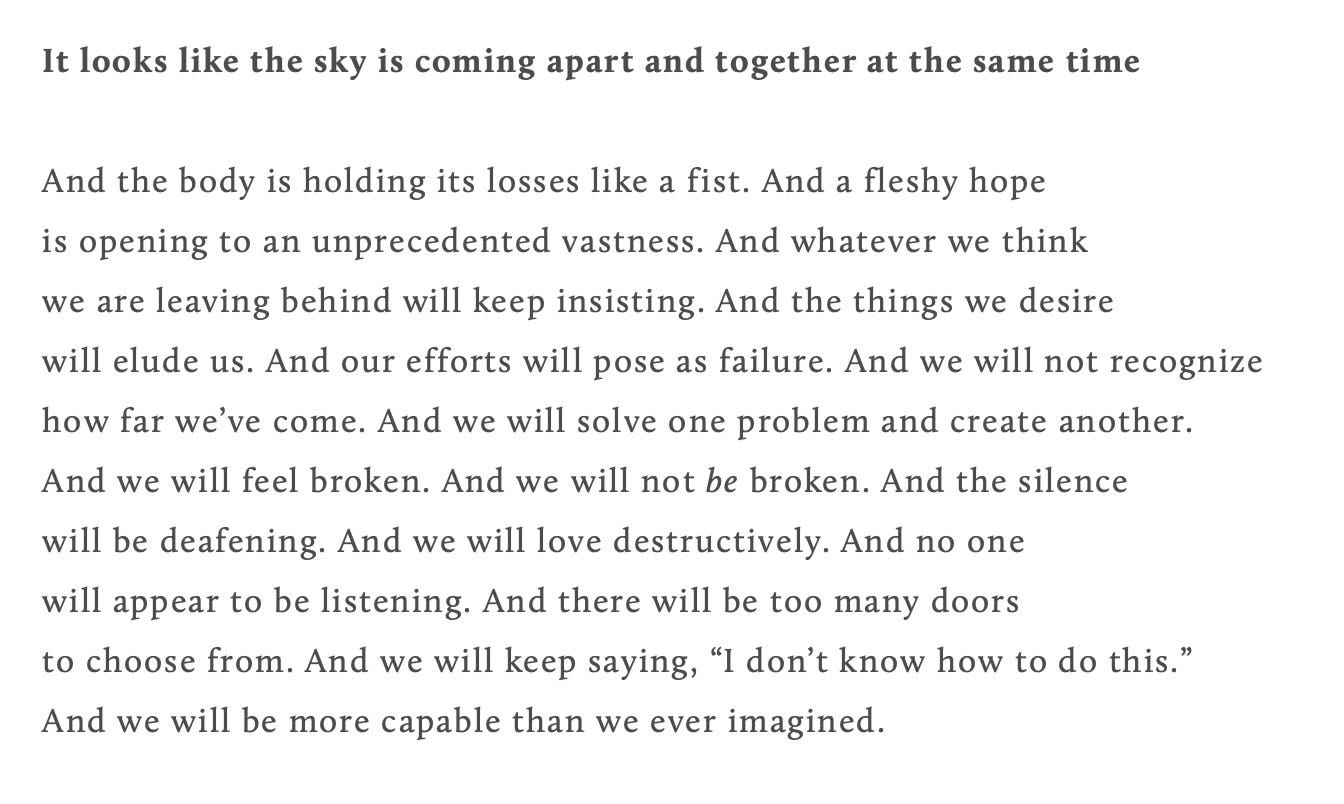 What I’ve discovered in this inquiry is that what began as a ritual became, too quickly, routine. I had been looking for a way to (re)connect with my body, something having to do with reminding myself of my own power. Of what I was capable of. For a few weeks, this looked like a 90-second plank; I’d get up after the timer chimed the final second and feel something resembling accomplishment, and this would be enough to carry me downstairs and into my day. But something fell apart these past six weeks—a confluence of internal need and external experience (perhaps an internal need that’s come as a result of external experience)—and that plank just couldn’t cover it. And so I see that what’s been happening outside was necessitating a call for a change inside.